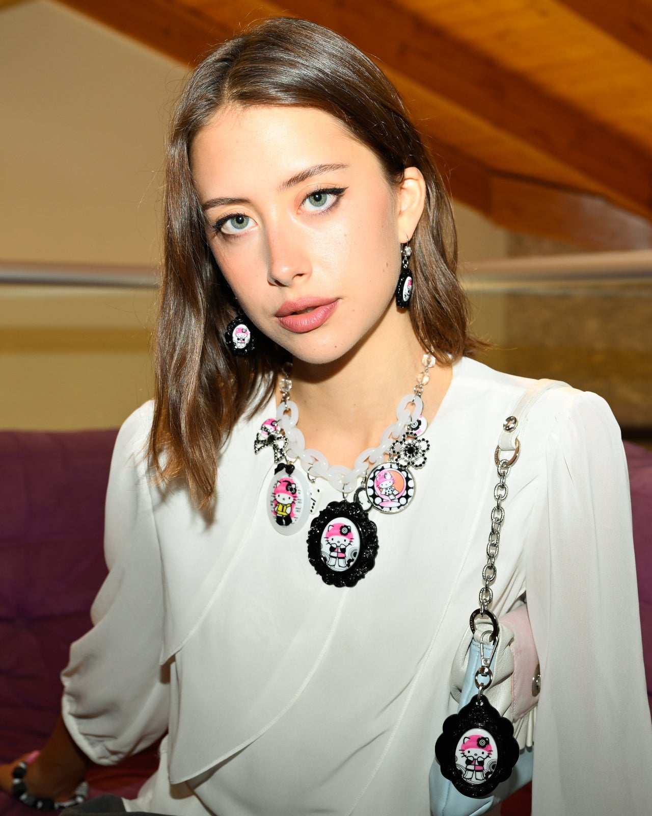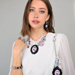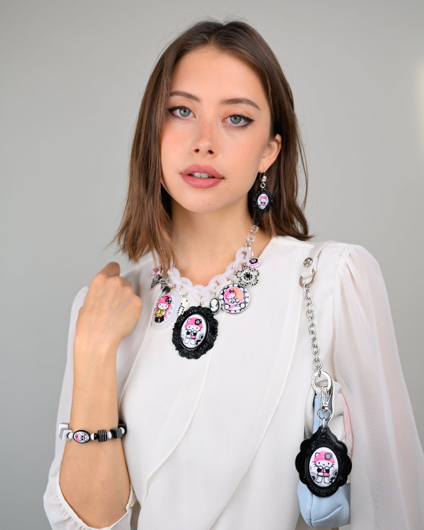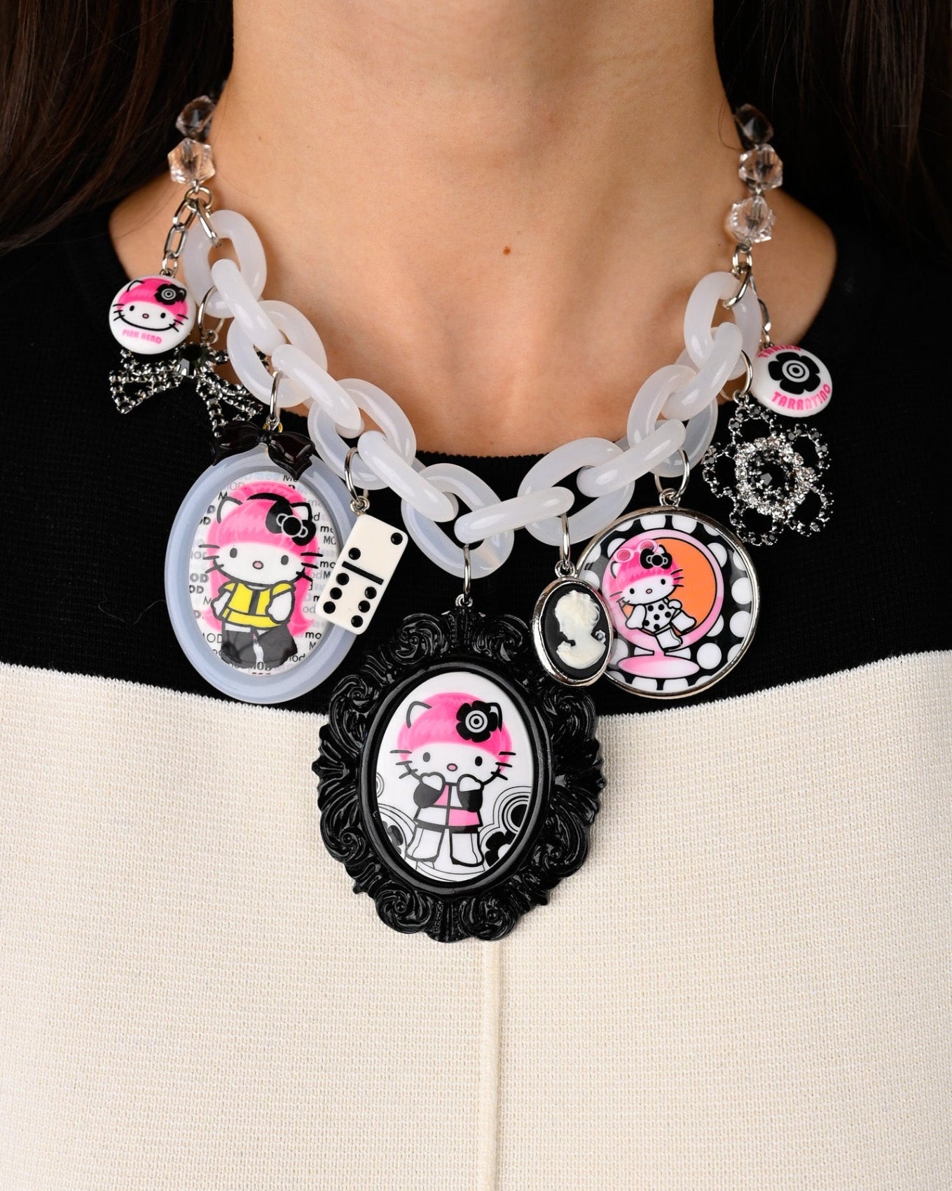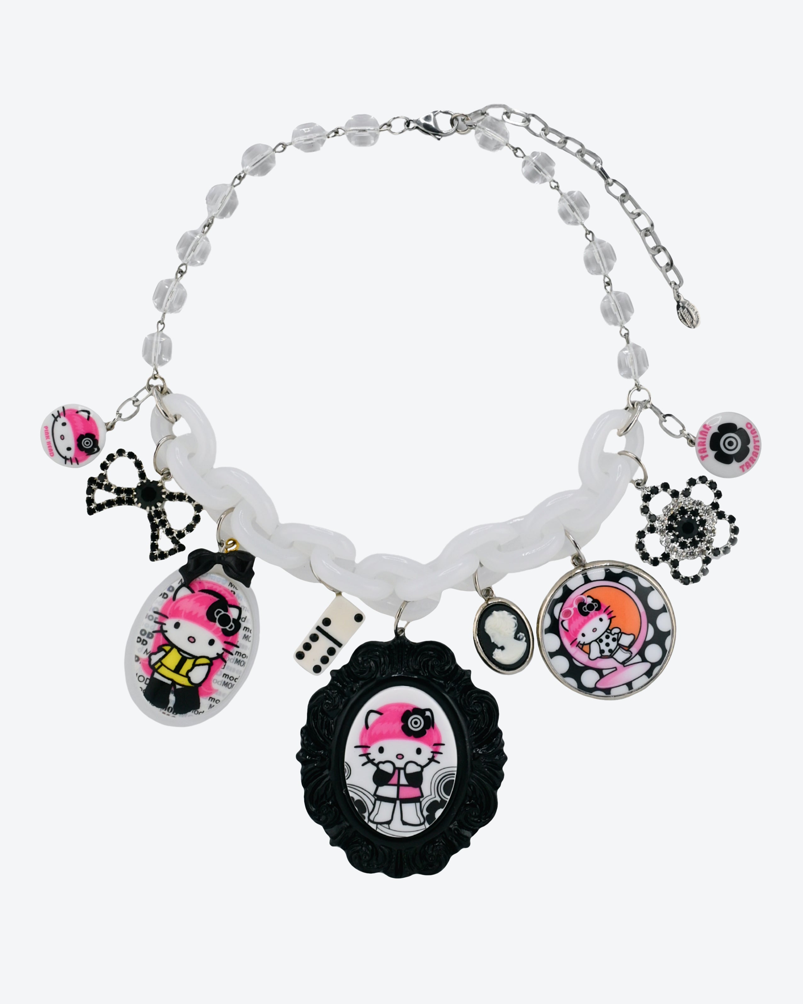 Irreverently fantastical and show stopping, the MOD KITTY SUPERCHARM features Hello Kitty Pink Head taking a trip through the swinging 60's Carnaby Street in London. Tarina has curated a collection of archival charms and Hello Kitty Pink Head x TARINA cameo pendants swinging sweetly from an adjustable lucite chain.