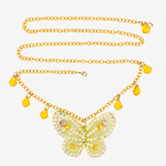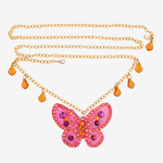 Introducing the BUTTERFLY LOLLY BELT. Its chain belt design and candy lucite Butterfly and Crystal chandelier pendant drops add a sexy cute touch while providing a versatile, adjustable fit. All crystal is SWAROVSKI. What makes this belt special? This piece can also be worn as a necklace, wrapped around or worn long. There are lobster clasps at both ends so you can clip the "tail" to the chain or let it drape down. Elevate any look with this sweet and stylish belt.