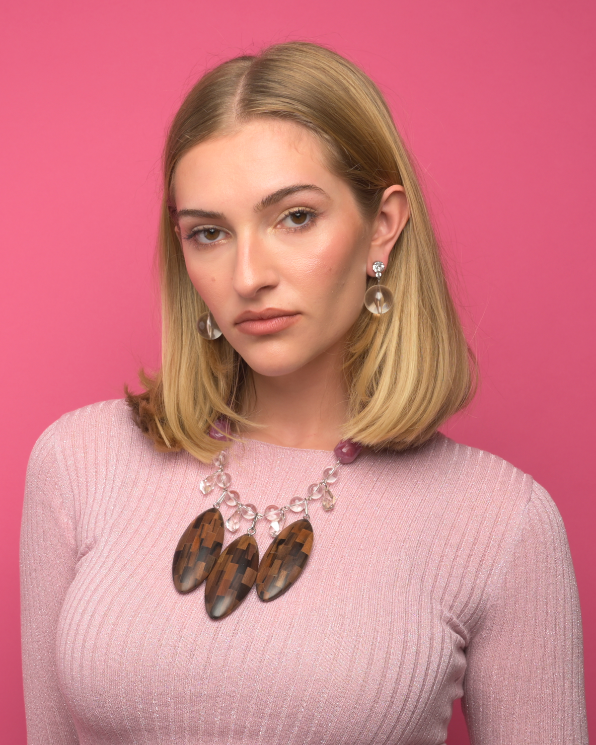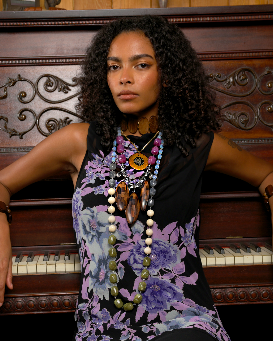 Electric Ladyland Cecklace features a bib style arrangement of hand carved laminated plaid boxwood pendants, gorgeous tumbled amethyst lucite, Swarovski Crystal Polygon pendant drops, Paparazzi Lucite and Opalescent moodust pressed glass beads.