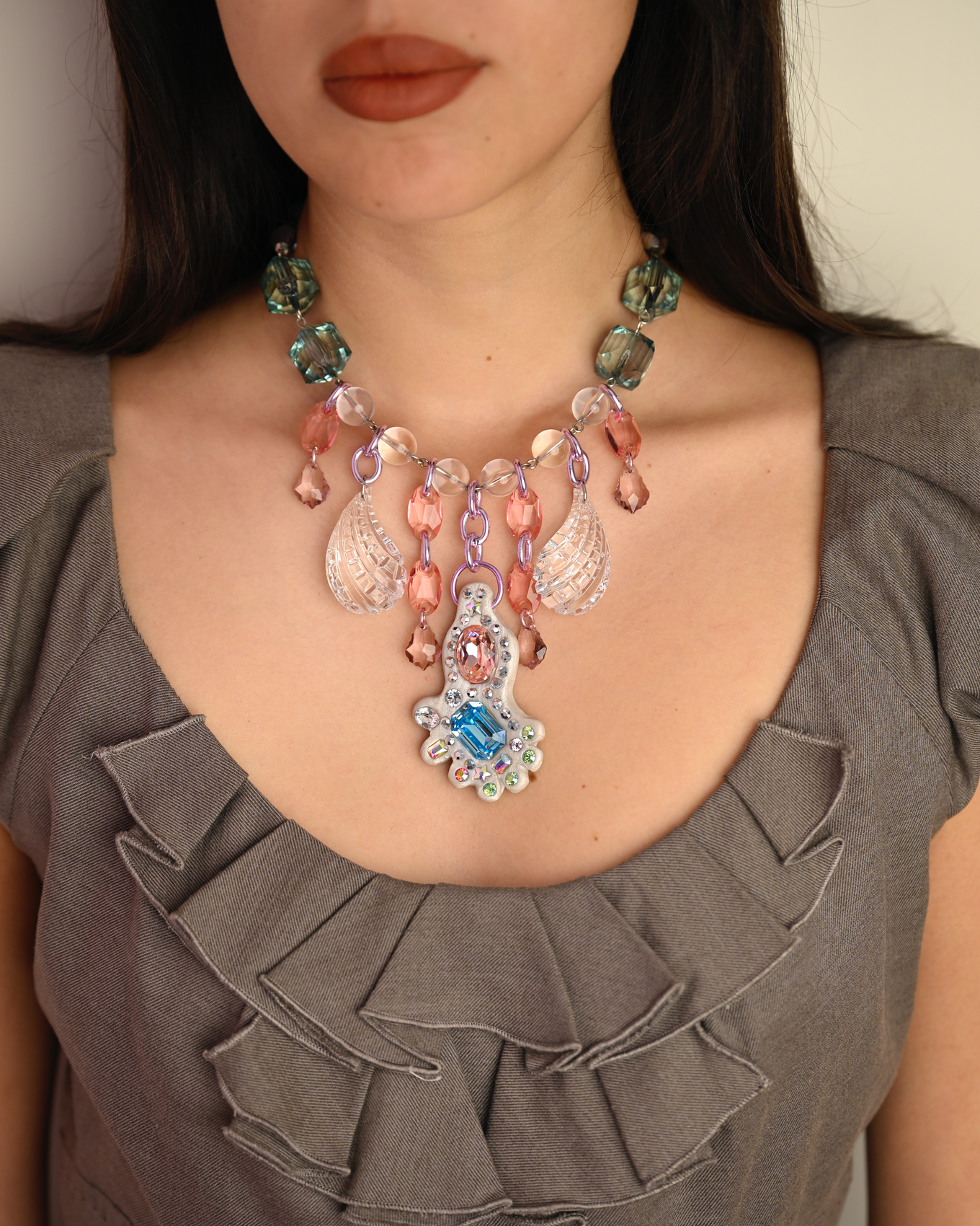 Memories of Green necklaces features a hand-sculpted resin and crystal pendant, archival exclusive lucite components, and Swarovski Crystal drops.