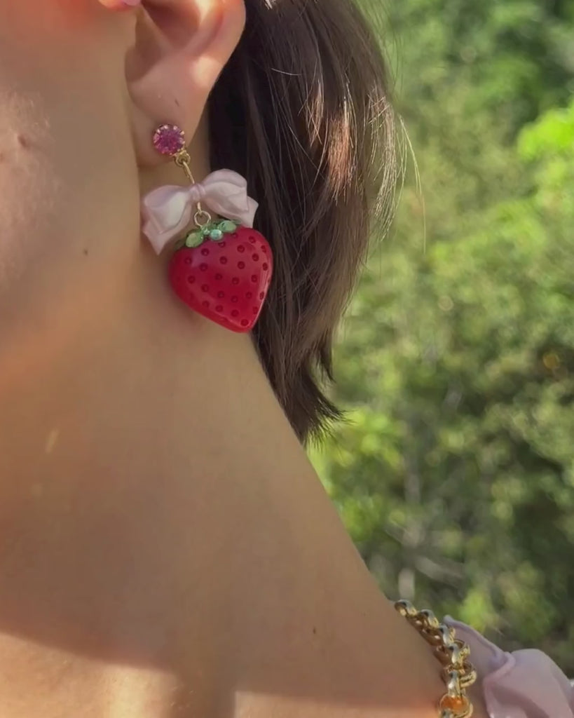Sweet summertime in the Berry Cafe. These earrings capture the mood of our favorite dessert cafes in Harajuku, Tokyo. Featuring Swarovski Crystal and our exclusive lucite strawberry pendants.
