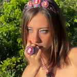 This is a ONE of ONE tiara that Tarina designed specifically to be featured in our new series; Candy Cameo, Episode 15 "It's Not Real Candy". This collectors piece features Tarina's hand sculpted cameo settings, our signature Neon Cameos and Swarovski Crystal.  Tarina's sculptural elements are all unique with the swirl of her curated polymer clay colors that can never be duplicated. The crystallized tiara frame is handcrafted with a vintage soldering method on a springy steel band with metal combs at back for secure hold.
