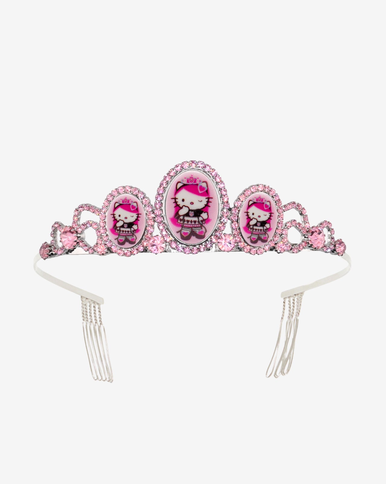 Featuring Queen Of Pink Hello Kitty x Tarina Pink Head collection cameos. This very exclusive crown is handcrafted with Swarovski crystal and metal combs at back to keep your crown in place.
