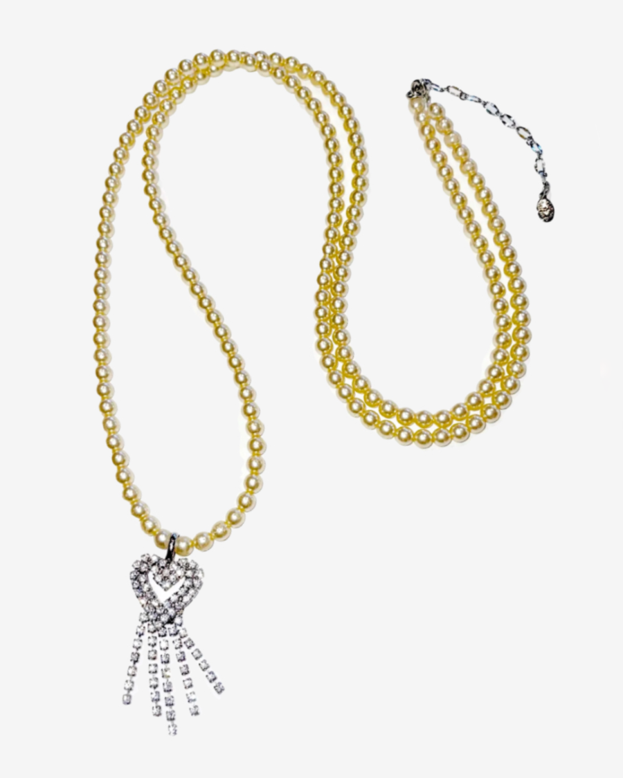 This extended length pearl pendant necklace is designed with a sparkling crystal cascading heart charm. Chic when worn alone or when layered.