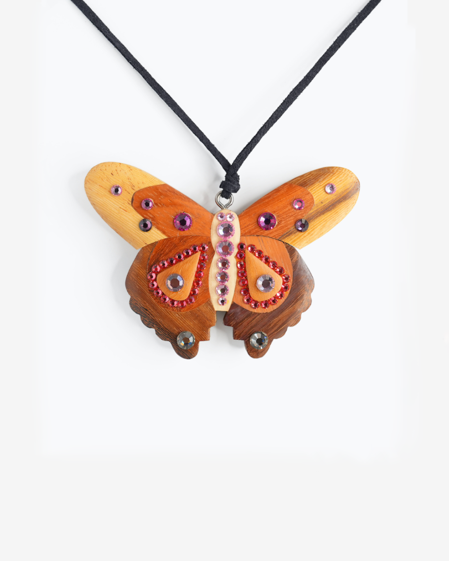 Our exclusive Swarovski Crystal embellished wood butterfly pendant on wrap cord.