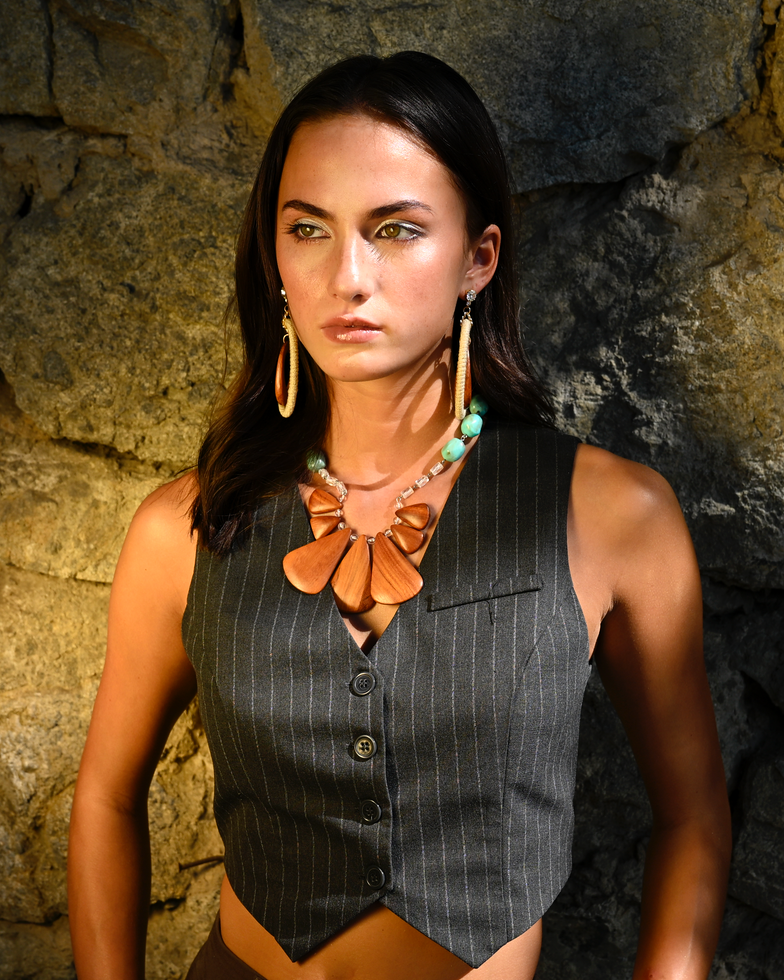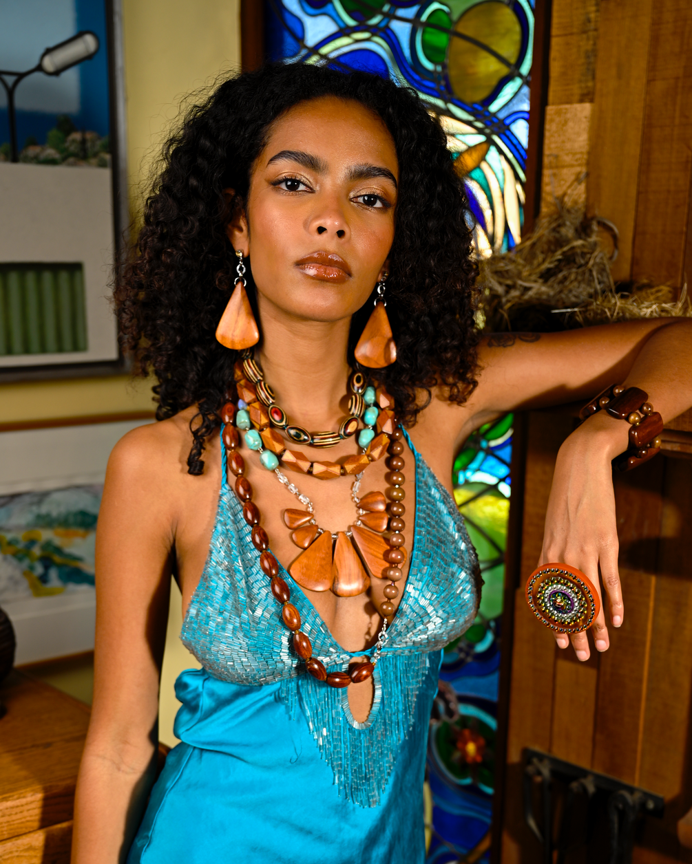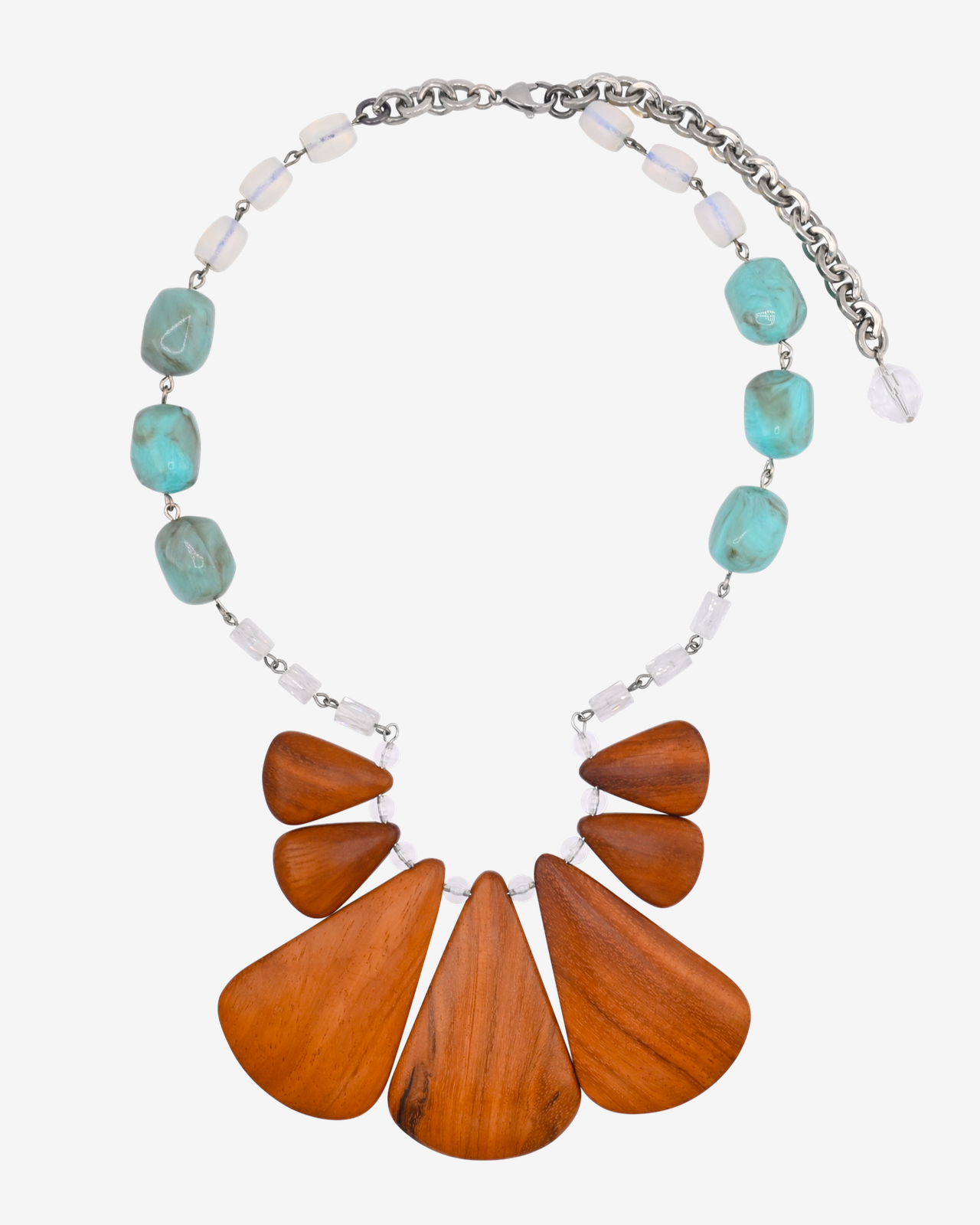 ART DECADE necklace features a bib style arrangement of hand carved wood pendants, gorgeous tumbled turquoise lucite, Opalescent moodust pressed glass beads and Cubic Zirconia barrel beads.