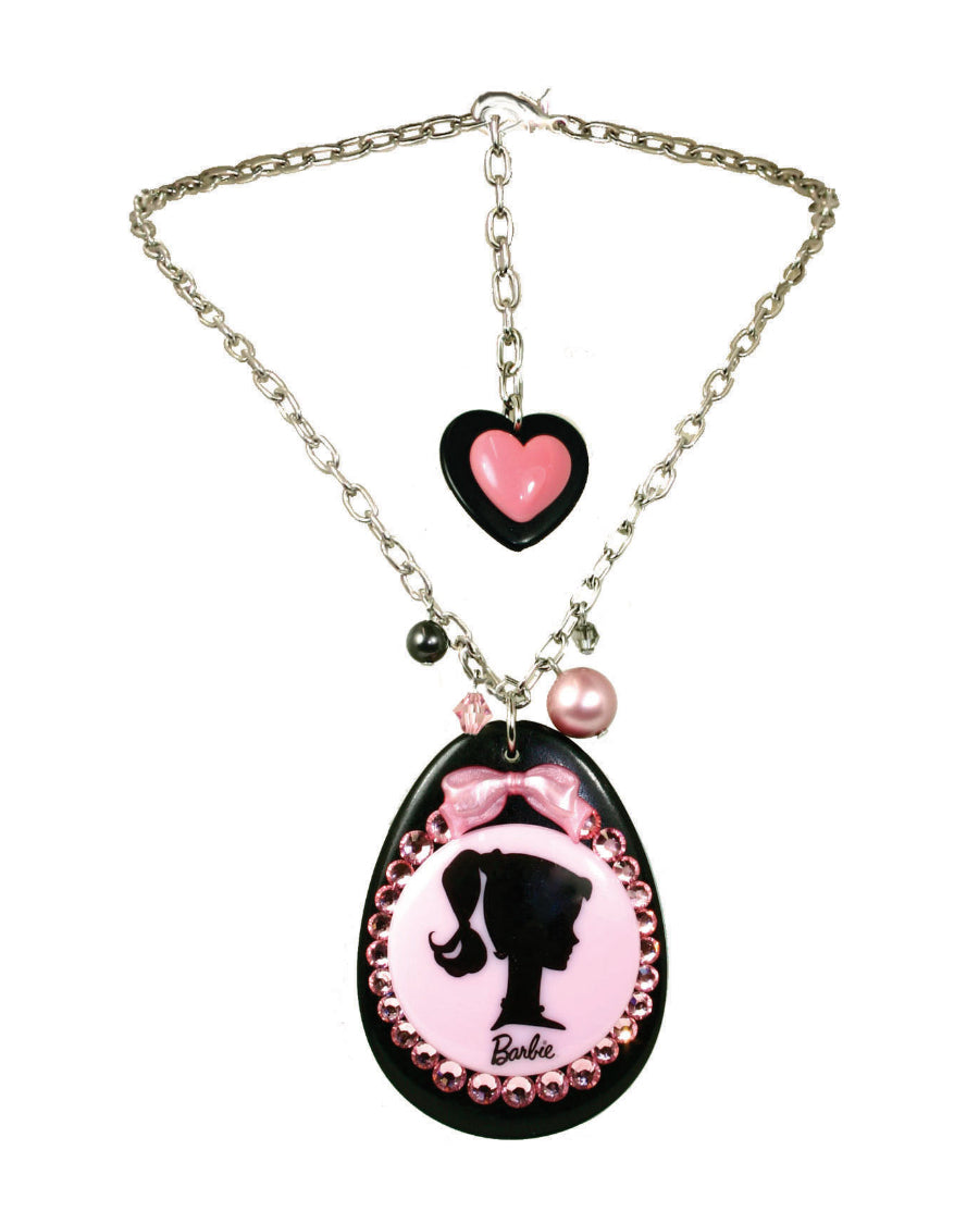 Barbie™ x Tarina Tarantino Exclusive Collection necklace featuring a cameo pendant on silver or gold plated brass chain, heart charm and Barbie by Tarina Tarantino authentication tag.