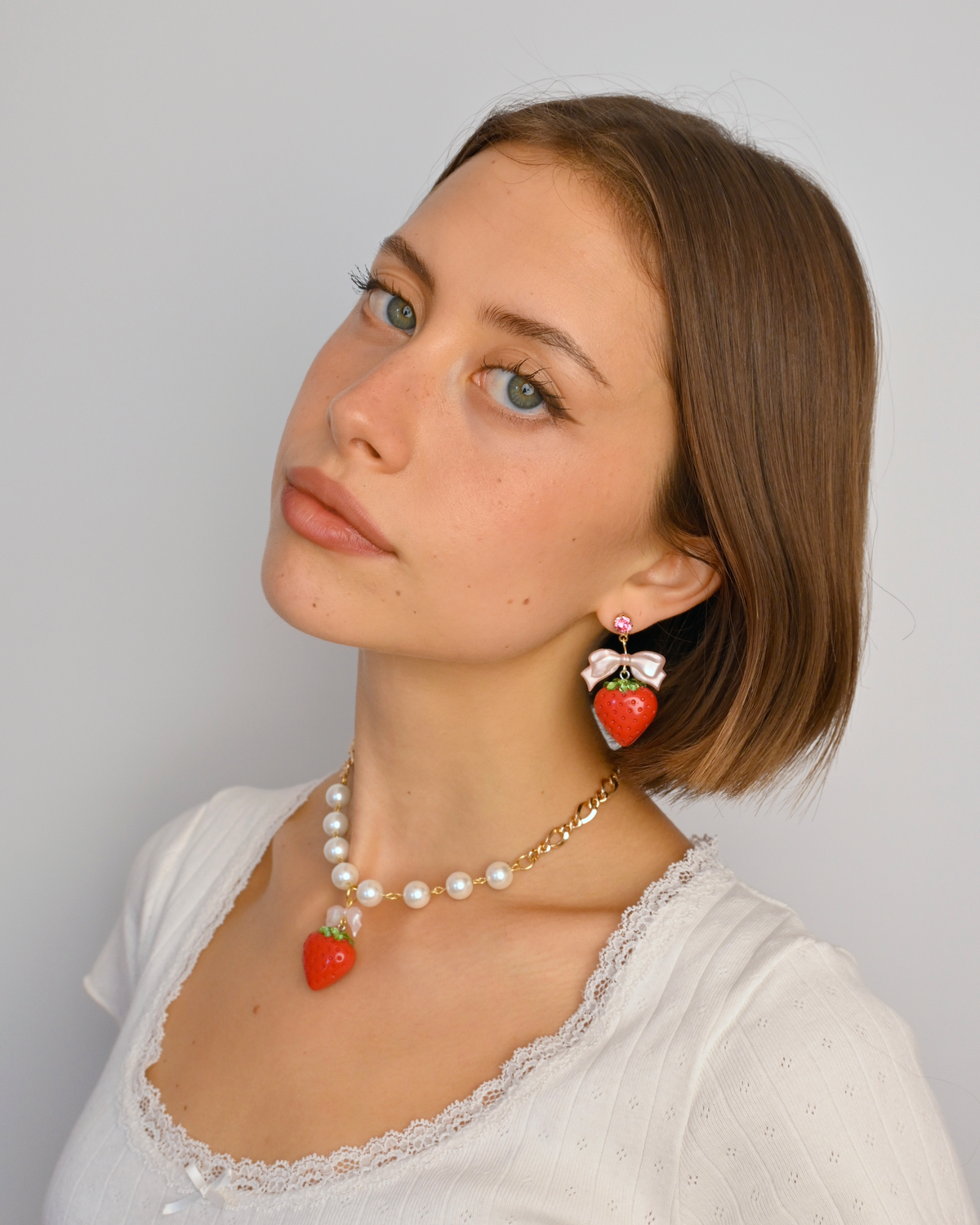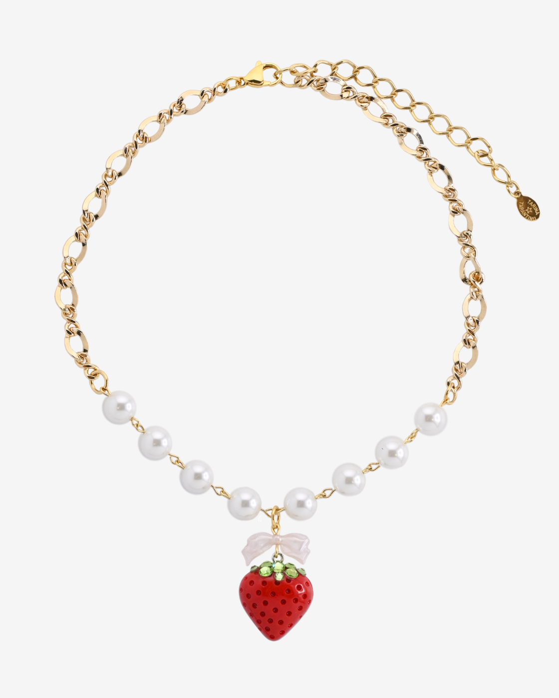 Features glass pearls and crystal-dusted resin strawberry pendant.