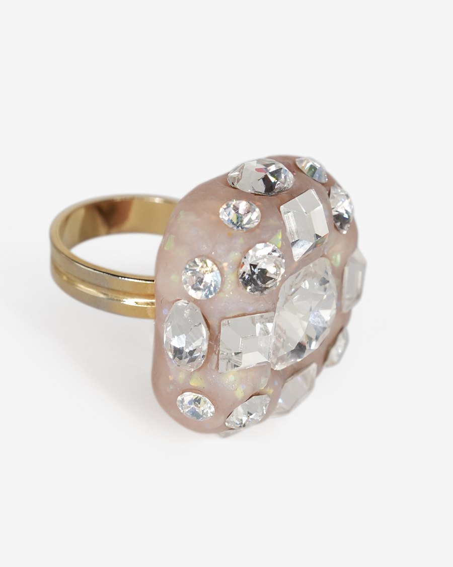 Hand sculpted by Tarina these cocktail rings are wearable pieces of art. The process in making this ring begins with mixing of colors and polymer clay to achieve the perfect shade - this alone can take days as Tarina likes to create her own color range for these pieces, the piece is then hand sculpted and formed around an internal metal skeletal shank for durability, finally the stones are set by hand and re-set after baking with epoxy. Each ring represents hours and hours of design and craftsmanship and no two are exactly alike.