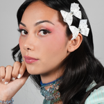 Little Lamb Bow Clip is approximately 3" wide and features French Ribbon, Swarovski crystal, salon-style clip and ultra-suede patch on the back for maximum grip.