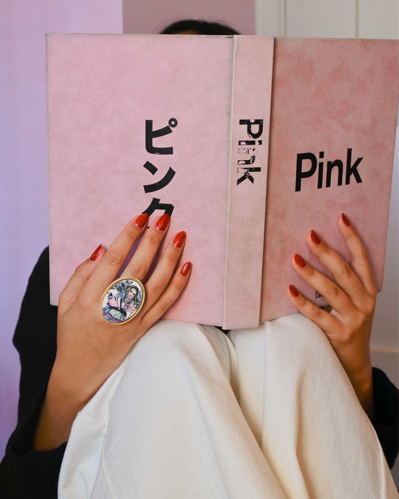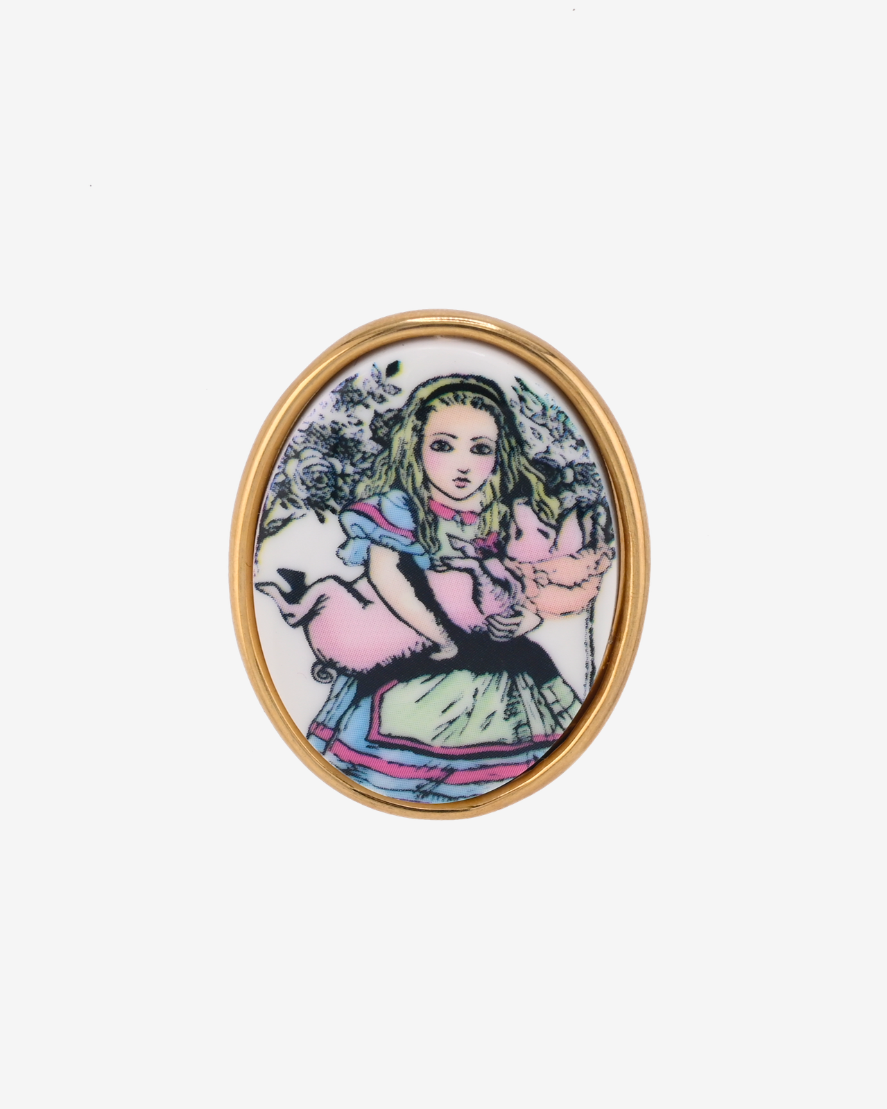 Alice In Wonderland x Tarina collection ring features an illustrated cameo of Alice holding the Pig Baby.
