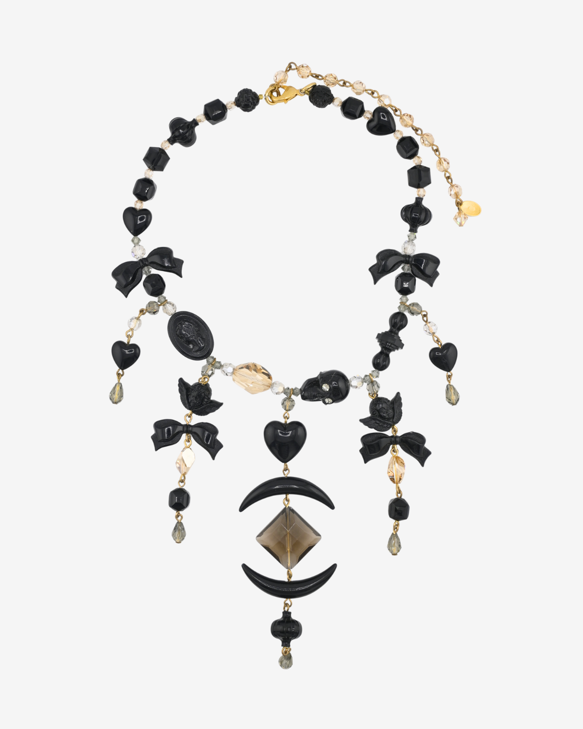 This bib style necklace is one of the center pieces of the collection featuring Bibarucci themed Angels, Hearts, Bows and more.