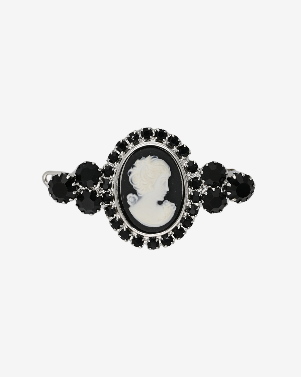 This is not a just hair clip - this is hair jewelry. Cameo Jeweled Clip features intricately crafted resin cameos framed by sparkling Swarovski crystals. The French lock closure ensures a secure and comfortable fit.