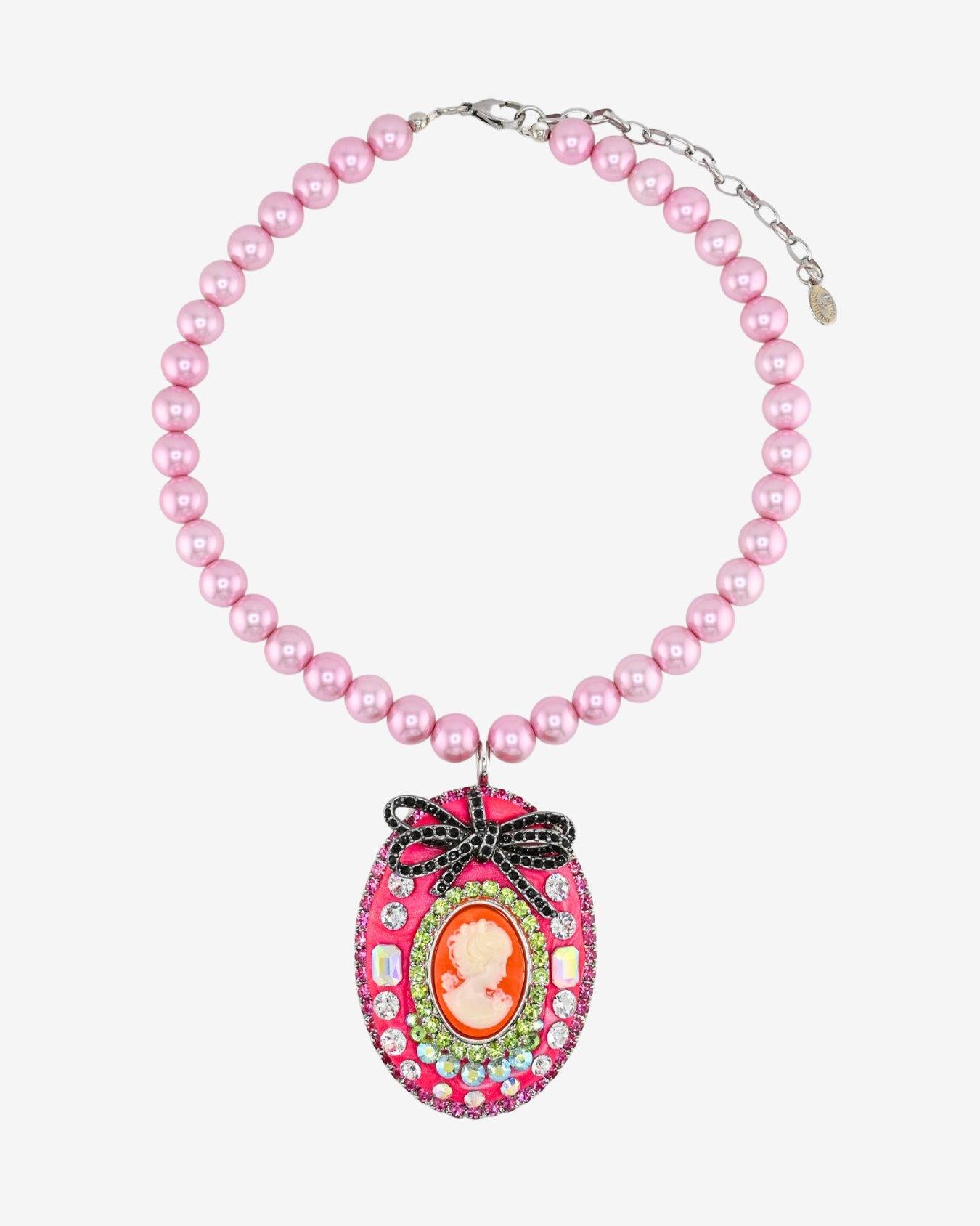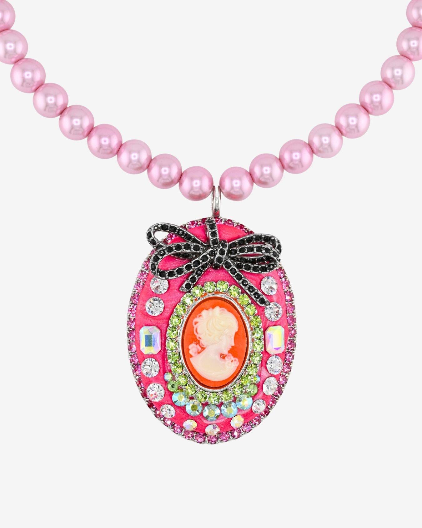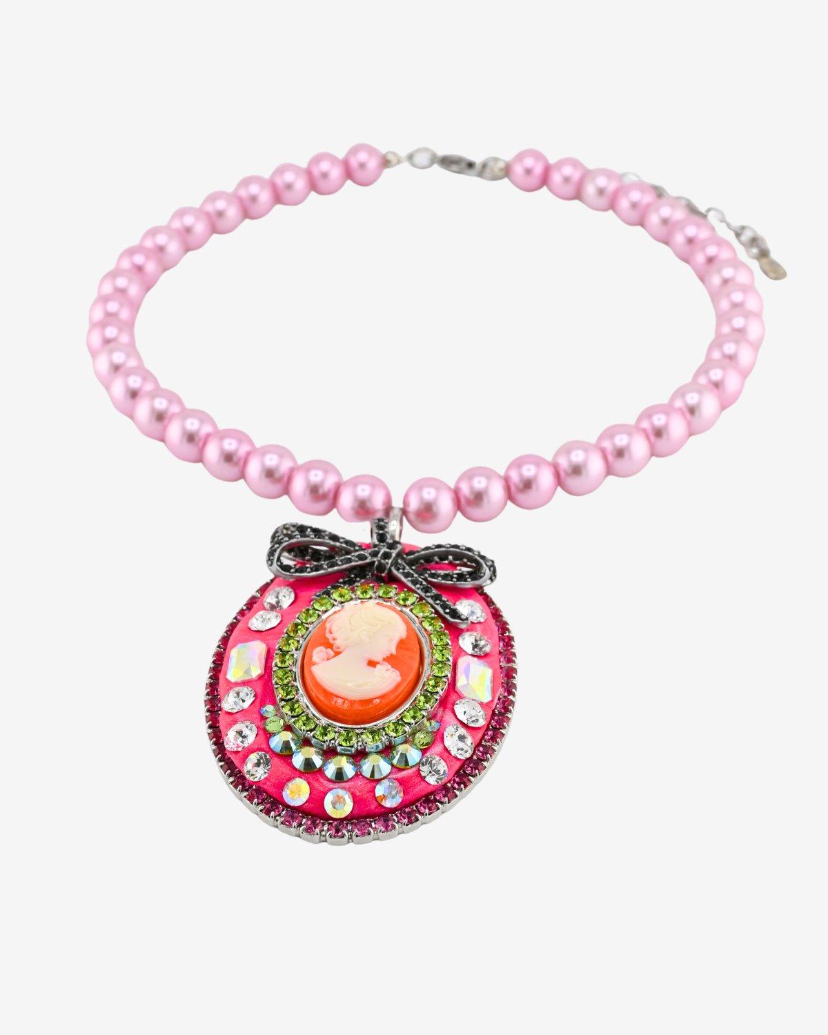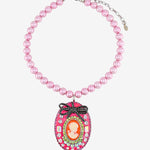 This is a ONE of ONE necklace that Tarina designed specifically to be featured in our new series; Candy Cameo, Episode 15 "It's Not Real Candy". This collectors piece features Tarina's hand sculpted cameo settings, hand set crystals, our signature Neon Cameos and Swarovski Crystal. Tarina's sculptural elements are all unique with the swirl of her curated polymer clay colors that can never be duplicated. The crystallized pendant frame is handcrafted with a vintage soldering method.