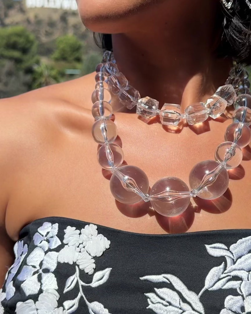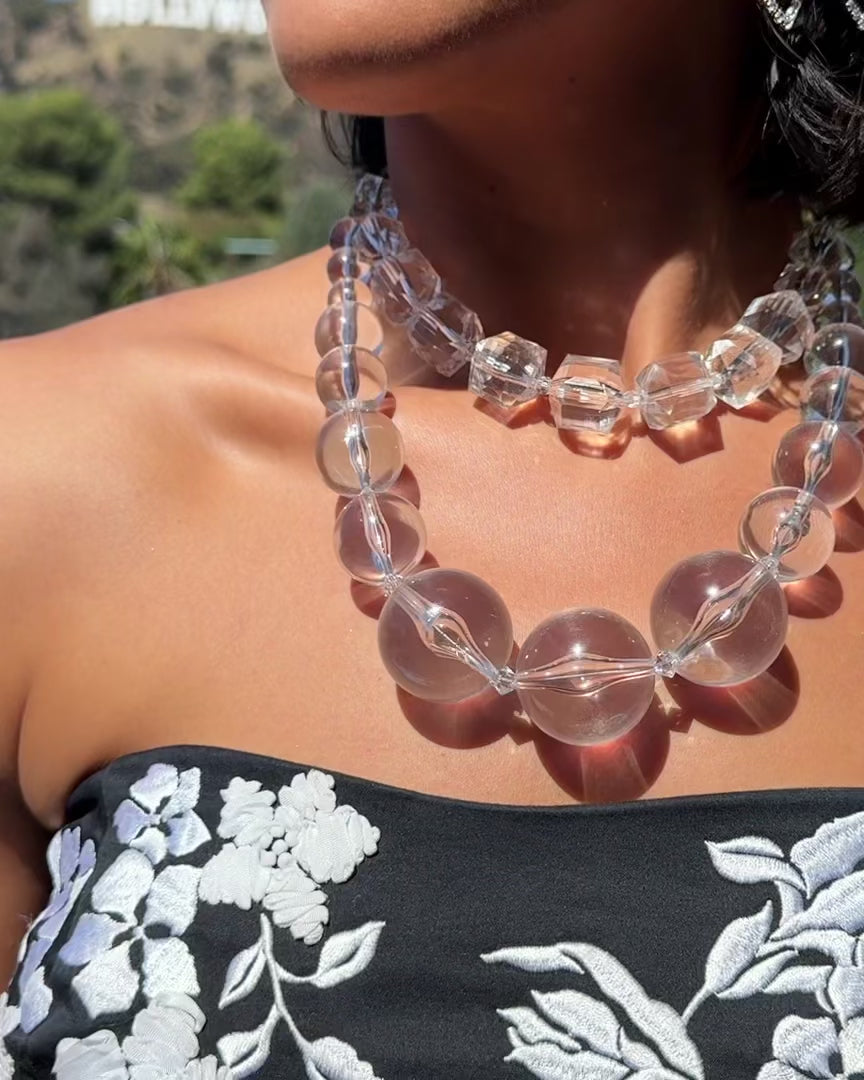 A chic and modern statement necklace featuring gorgeous glass-like lucite beads. Our "Paparazzi" lucite beads have a special feature, they pop with light under flash photography. This necklace goes with everything in your closet.