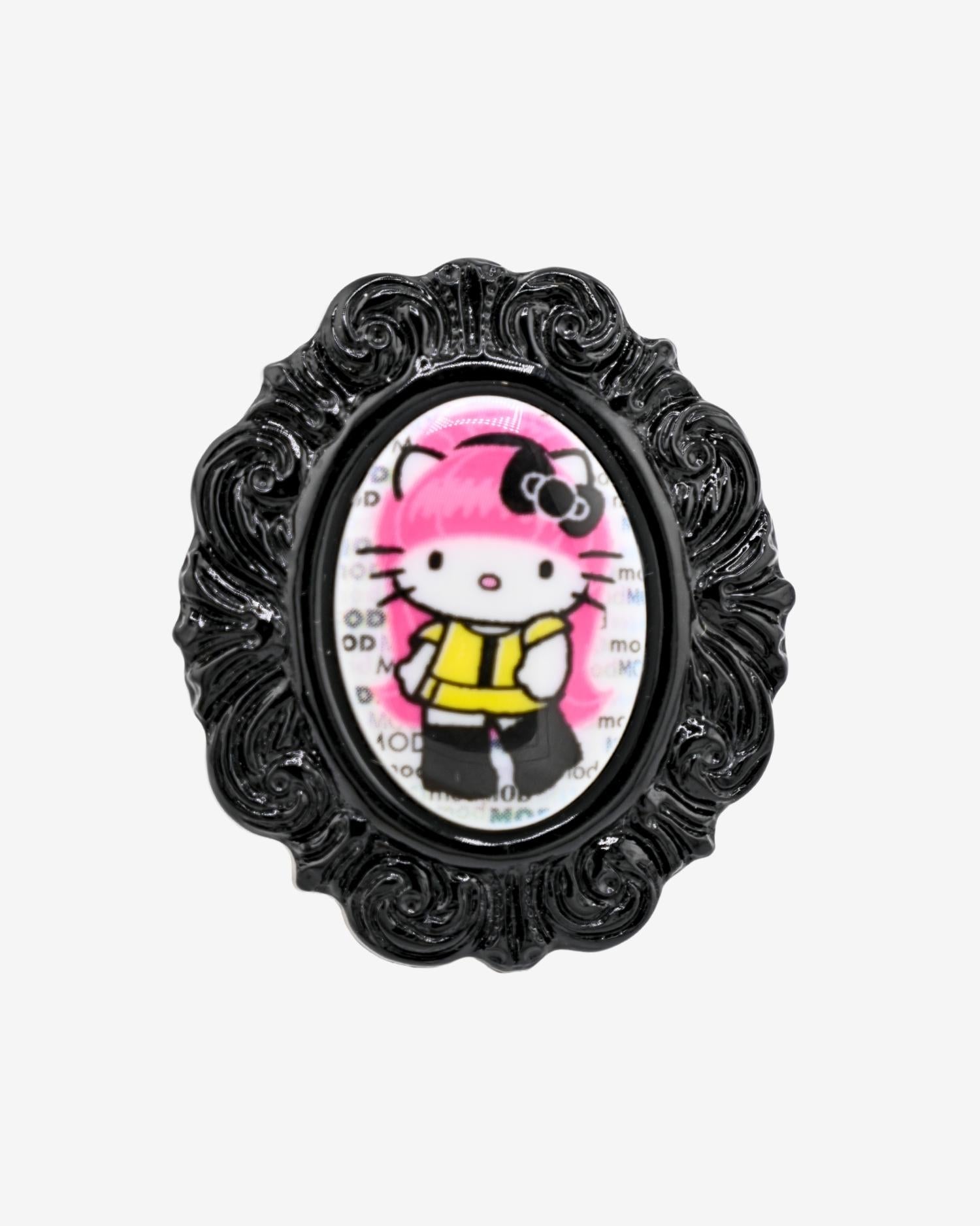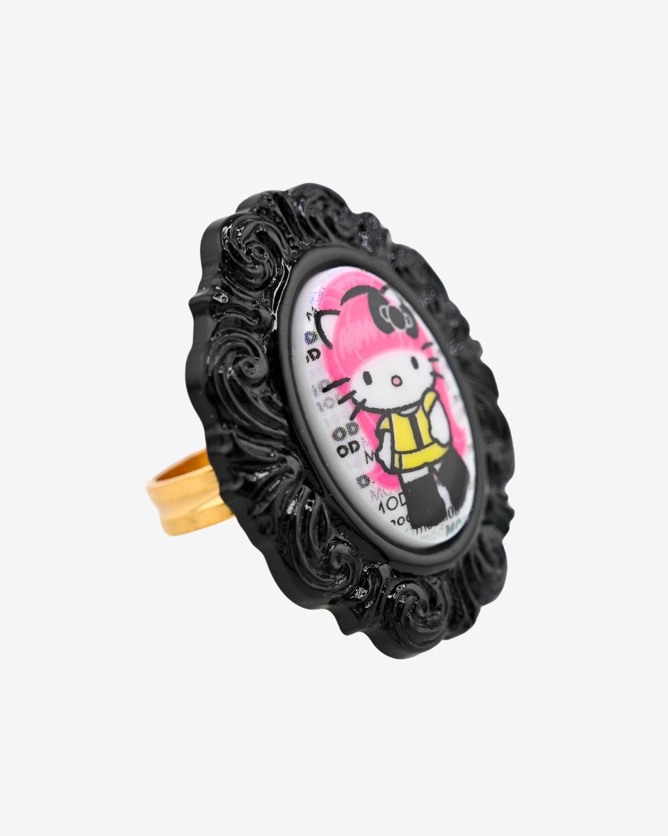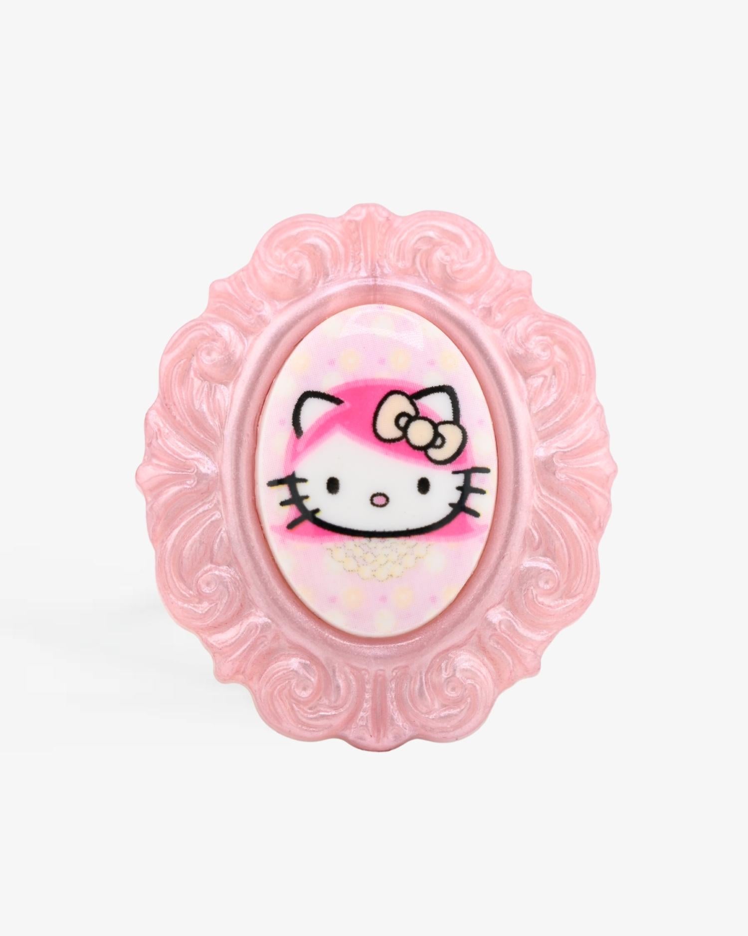 Adjustable ring featuring Hello Kitty x Tarina Tarantino "Pink Head" collection cameo in a baroque style lucite frame.