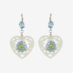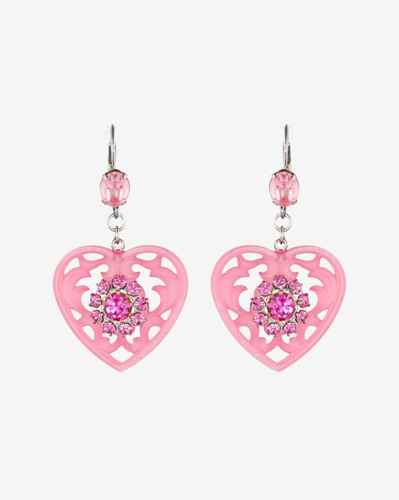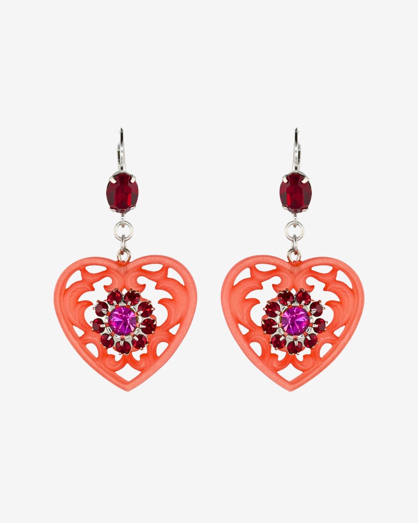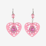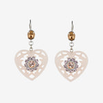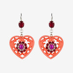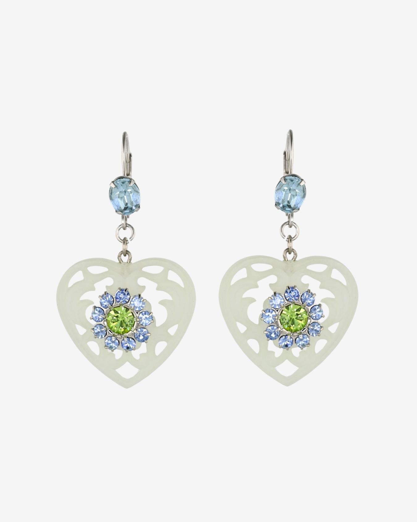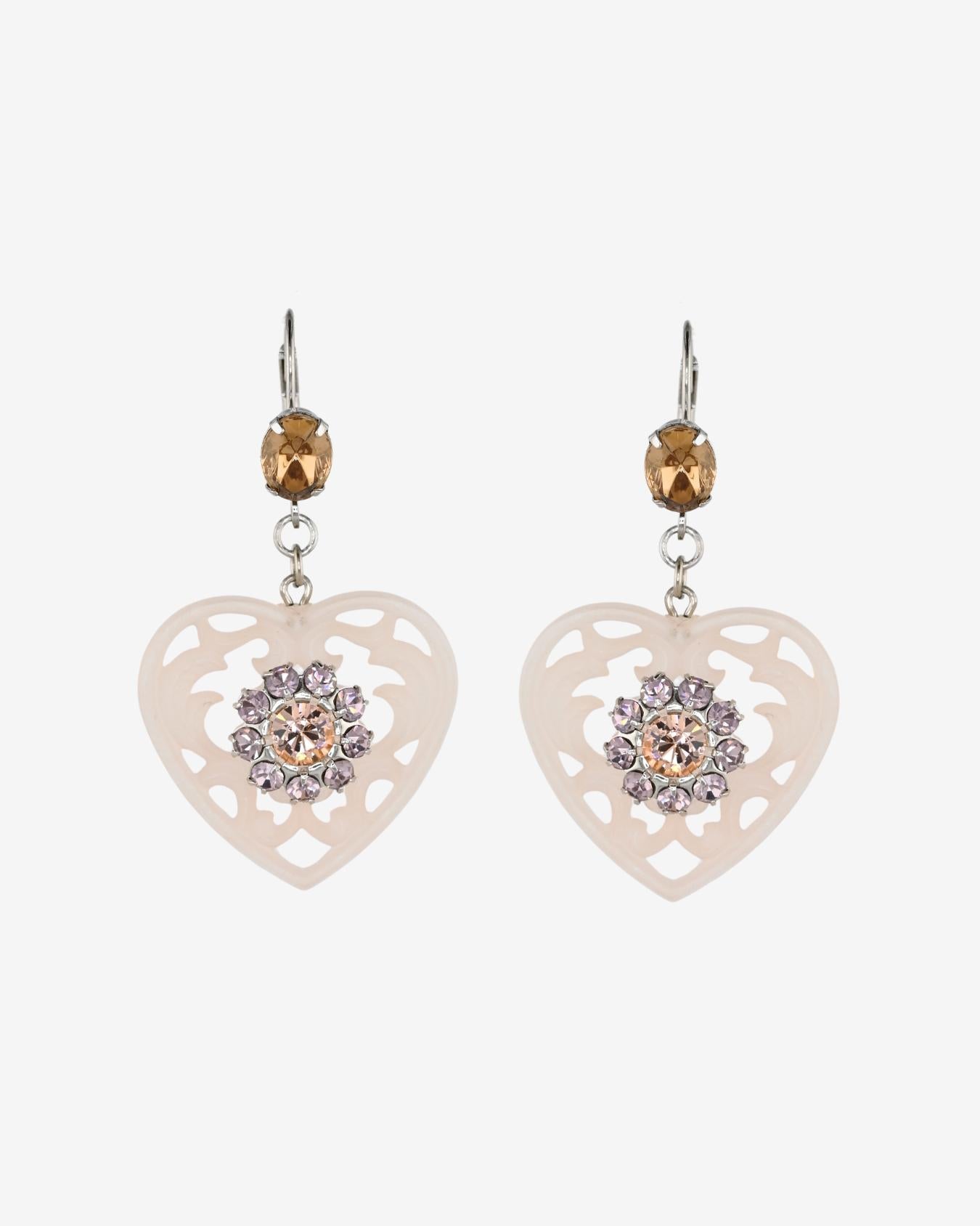 Whisper light in weight, but big pretty elegance. Inspired by the heart doilies at Grandma's house, our lucite lace earrings feature prong set crystal flower embellishments. The lacey heart pendants hang gently from a Swarovski crystal set lever back post.