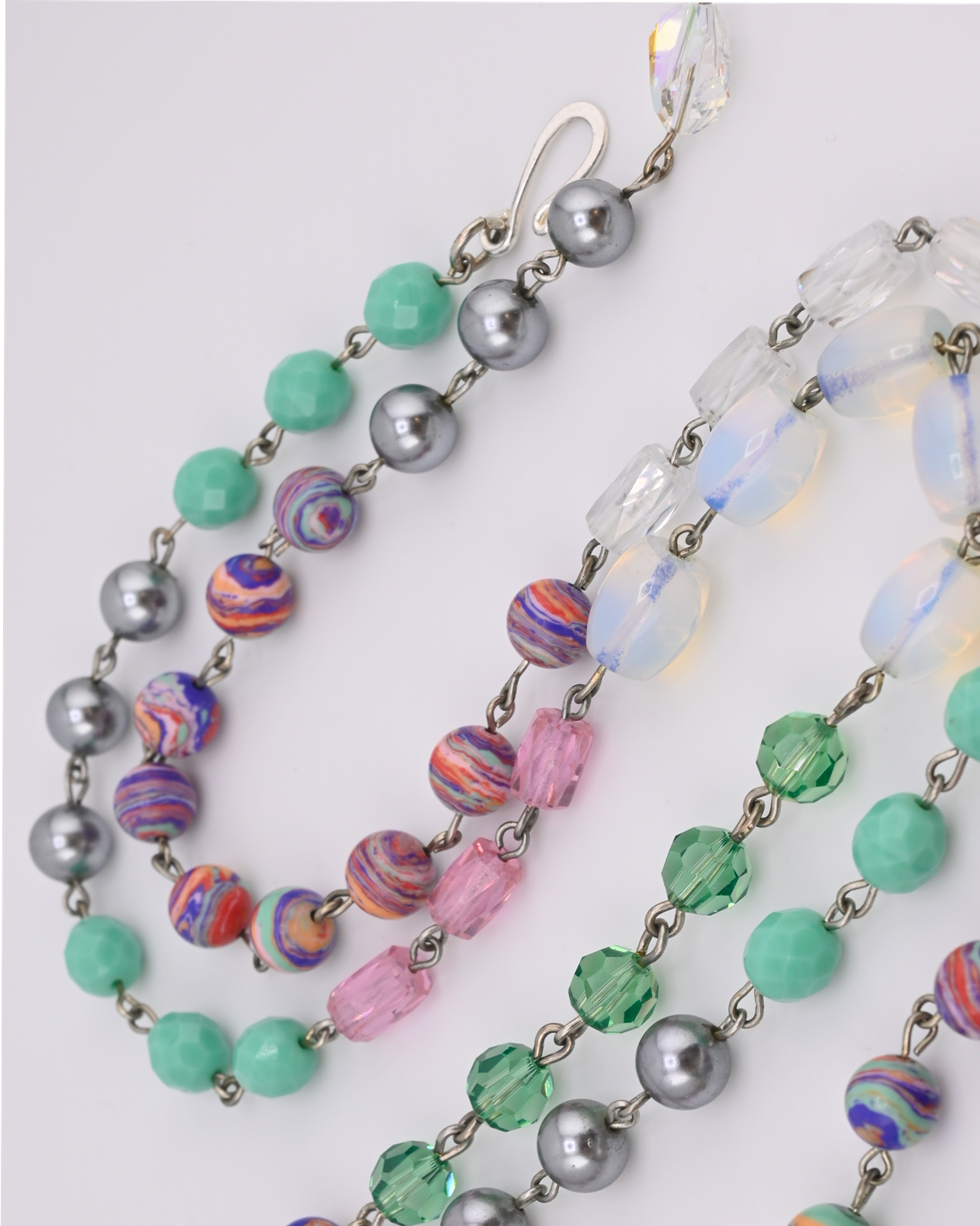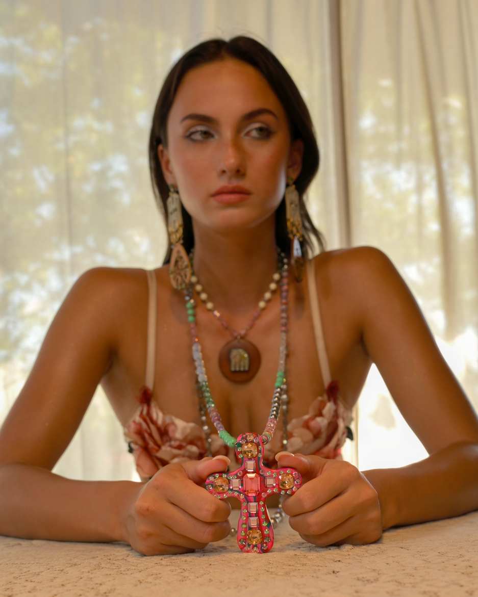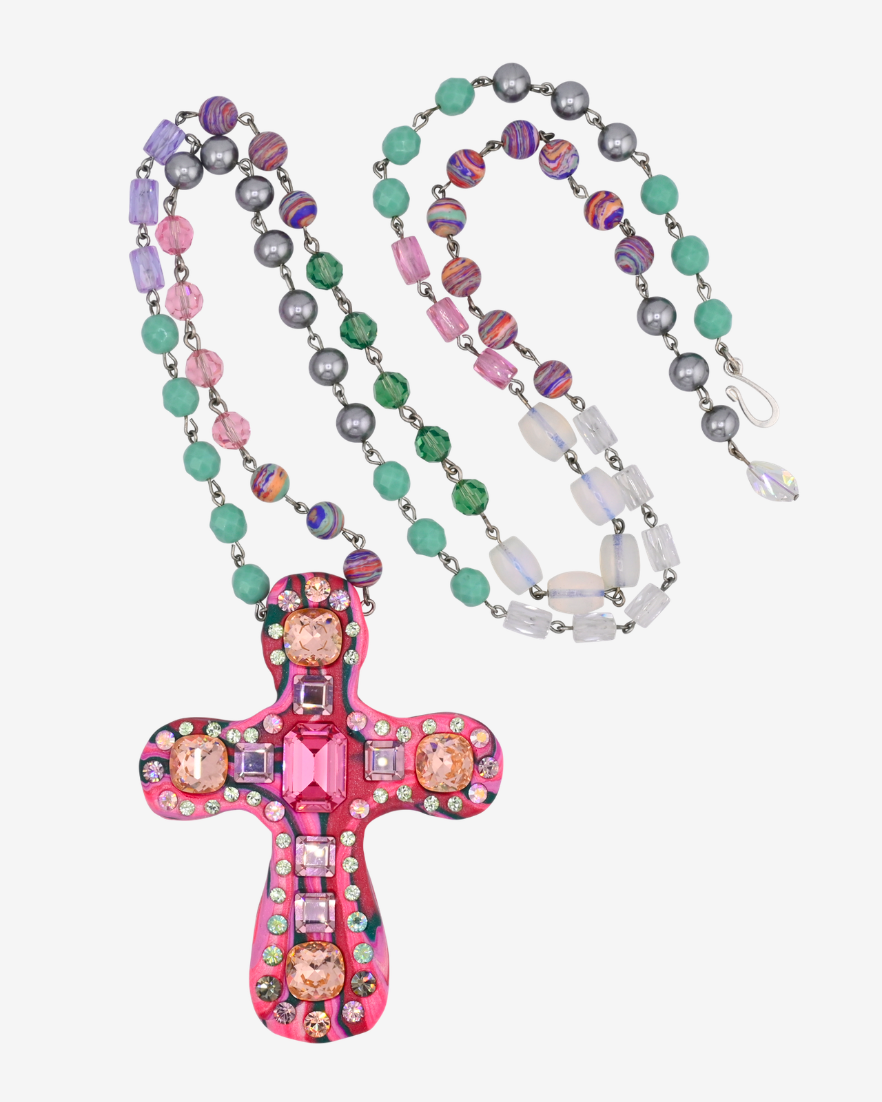 LIKE A PRAYER is a wearable piece of art. Featuring a Swarovski Crystal and Polymer Resin cross pendant hand sculpted by Tarina. Crystals are from our Swarovski archive collection selected for this season. The bead chain features Cubic Zirconia beads, Swarovski crystal and pearl beads, pressed glass and galaxy marbelized stone beads.