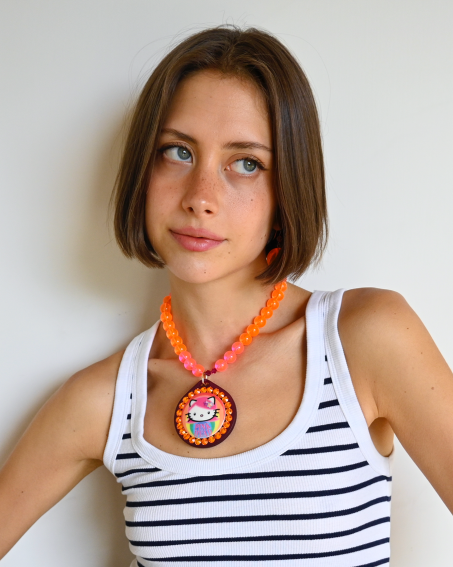 Hello Kitty x Tarina "Pink Head" collection Neon Kitty Necklace with our signature glowing neon lucite beads and Swarovski Crystal framed Hello Kitty Pink Head cameo pendant.