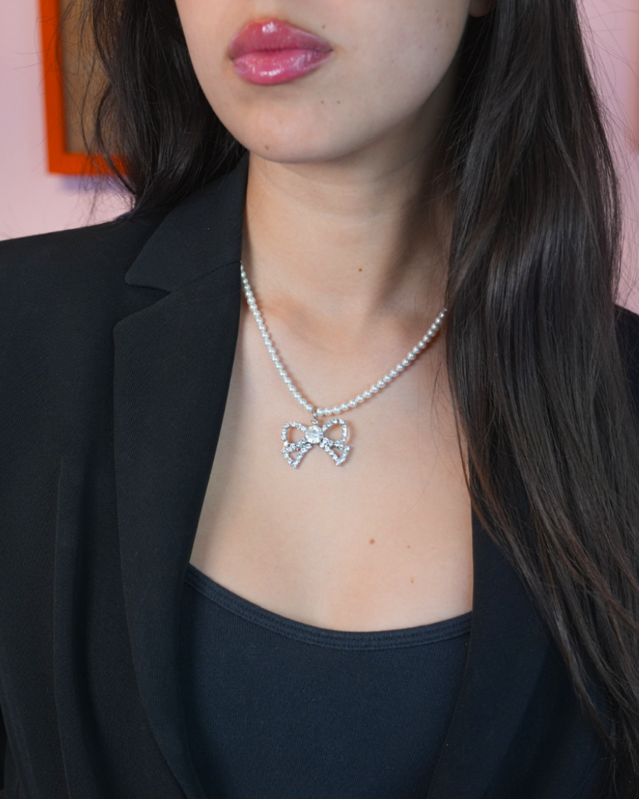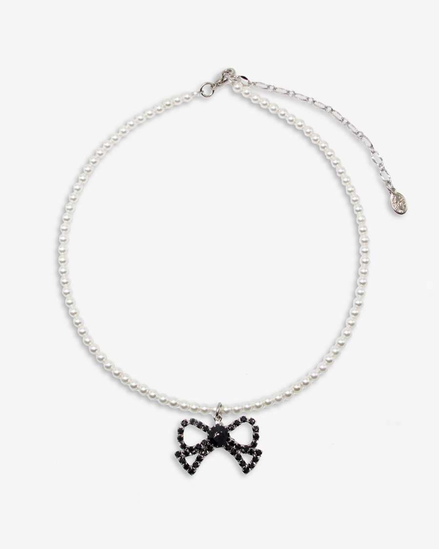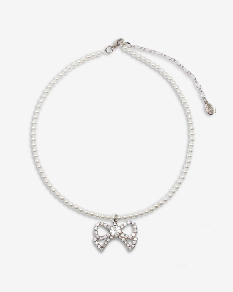 The Petit Cadeau Necklace is a perfect blend of timeless charm and modern sparkle. A strand of glass pearls frames a Swarovski crystal bow pendant, a signature Tarina Tarantino motif that embodies playful sophistication.