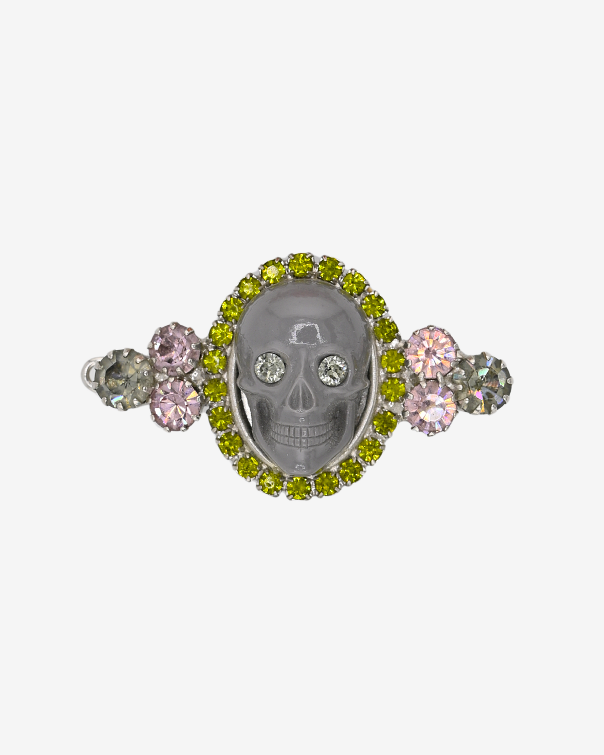 Skull Portrait Clip features intricately crafted resin skulls framed by sparkling Swarovski crystals. This is goth with a candy twist. The French lock closure ensures a secure and comfortable fit.