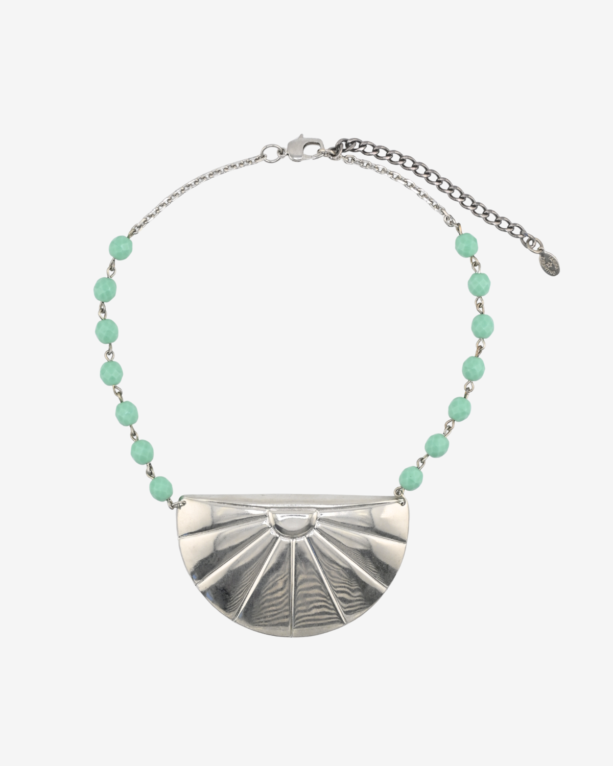 A simple statement necklace for every day. Art deco inspired sunrise pendant on turquoise glass beaded chain.