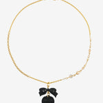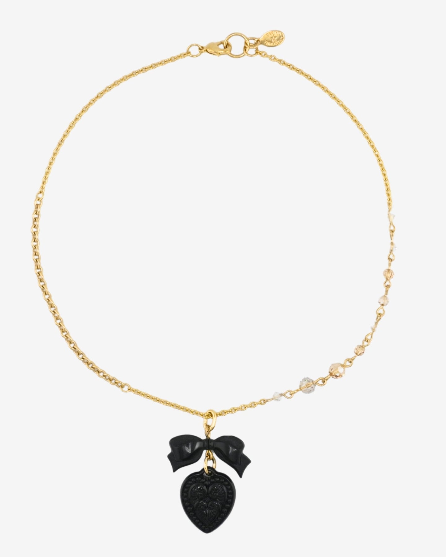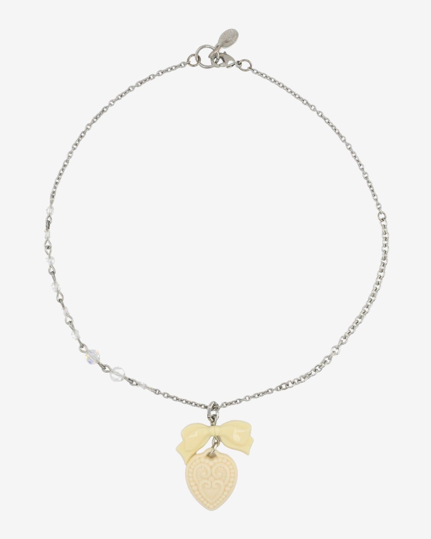 A favorite from our archives, part of the 2008 BIBARUCCI collection, Sweet Nothings features a chain stationed with Swarovski Crystal on one side for an offset chic look and our signature lucite heart and bow pendant in ivory or black.