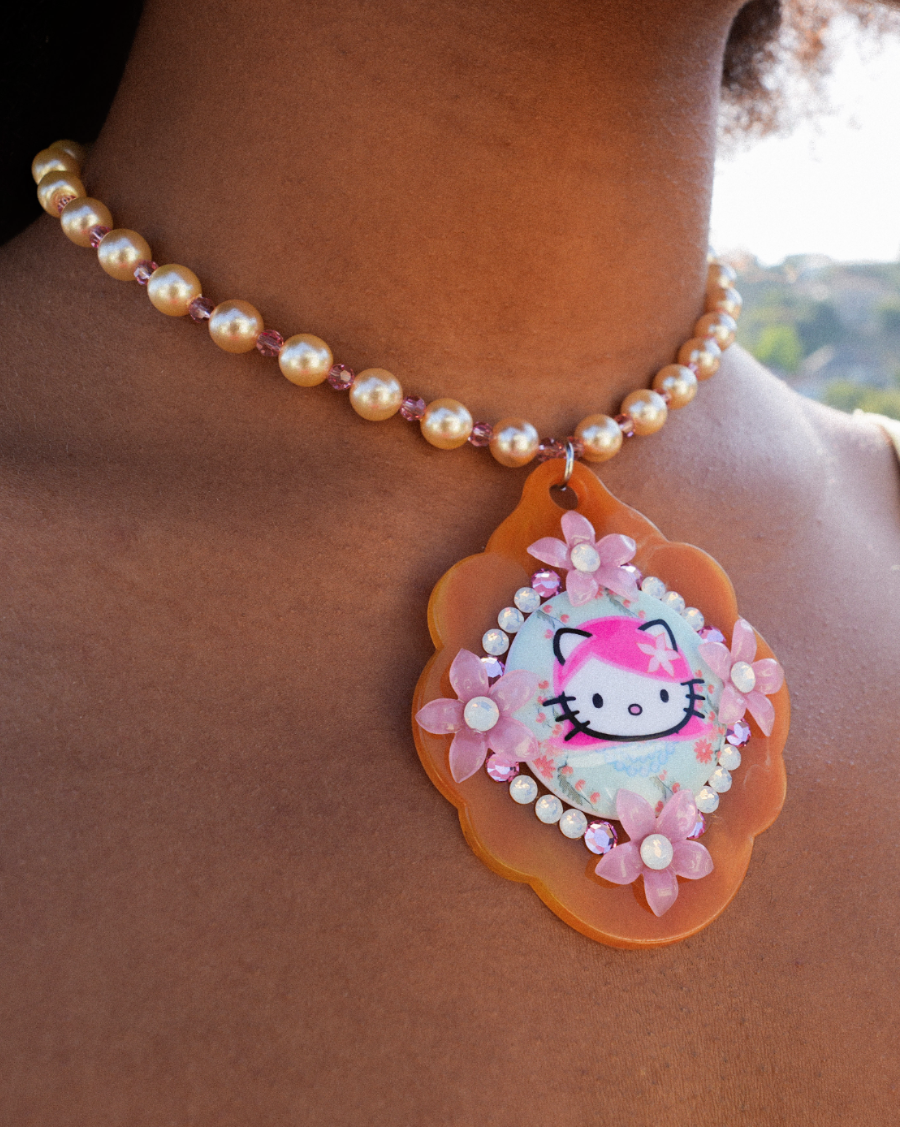 Swarovski pearl and Crystal bead necklace with a sparkling vintage style collage pendant, featuring Hello Kitty x Tarina "Pink Head" collection cameo.